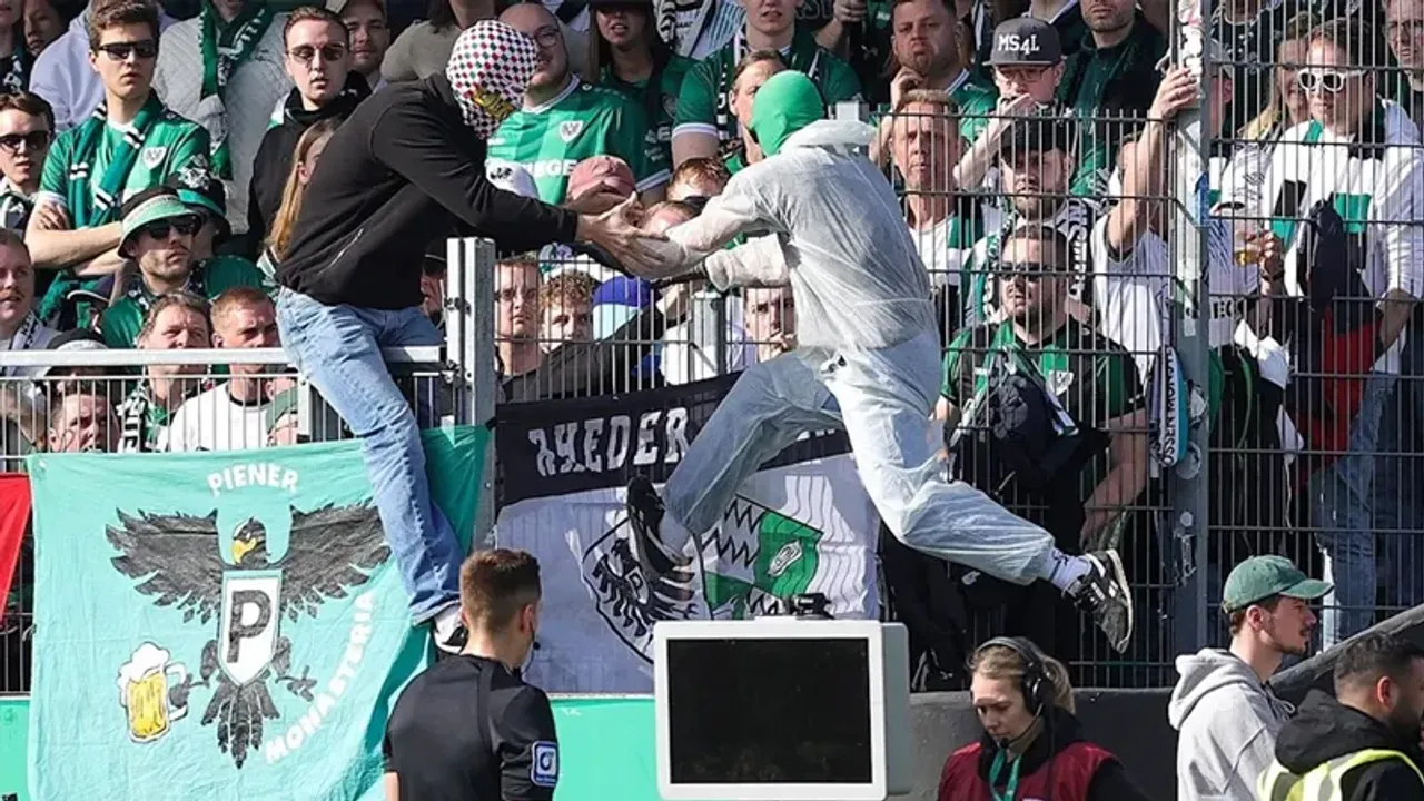 Ancak bu sırada sahaya giren Preussen Münster taraftarları VAR monitörünün kablosunu çekti. Monitörün çalışmaması nedeniyle hakem pozisyonu izleyemedi.