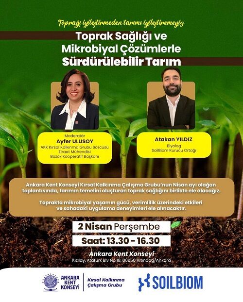 Ankara Kent Konseyi (AKK) Kırsal Kalkınma Çalışma Grubu ve SOİLBİOM iş birliğiyle “Toprak Sağlığı ve Mikrobiyal Çözümlerle Sürdürülebilir Tarım” konulu bir program gerçekleştirilecek. Etkinlik, tarımda sürdürülebilirliği ve verimliliği artırmayı hedefliyor.