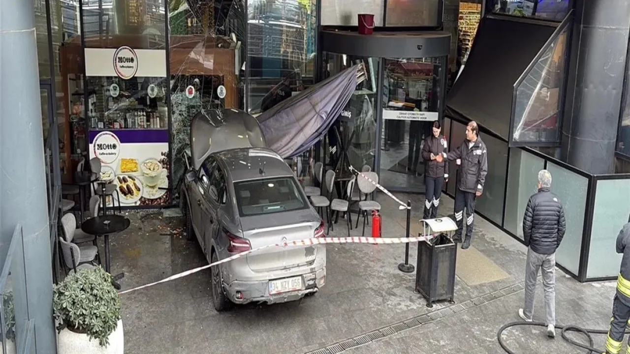 Otomobil, 3 metre yükseklikten düşerek giriş katında bulunan kafeye girdi. Otomobilin çarptığı çay kazanın üzerine devrildiği 1 çalışan yaralandı.