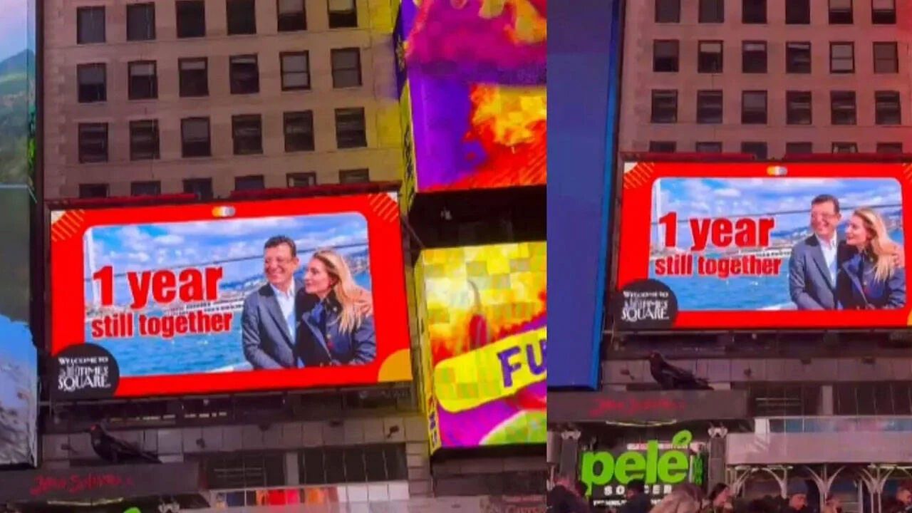 İstanbul Büyükşehir Belediye Başkanı ve CHP’nin cumhurbaşkanı adayı Ekrem İmamoğlu’nun gözaltına alınmasının yıl dönümünde, meydandaki dev dijital panolardan birinde Ekrem İmamoğlu ile eşi Dilek İmamoğlu’nun fotoğrafı yayımlandı.