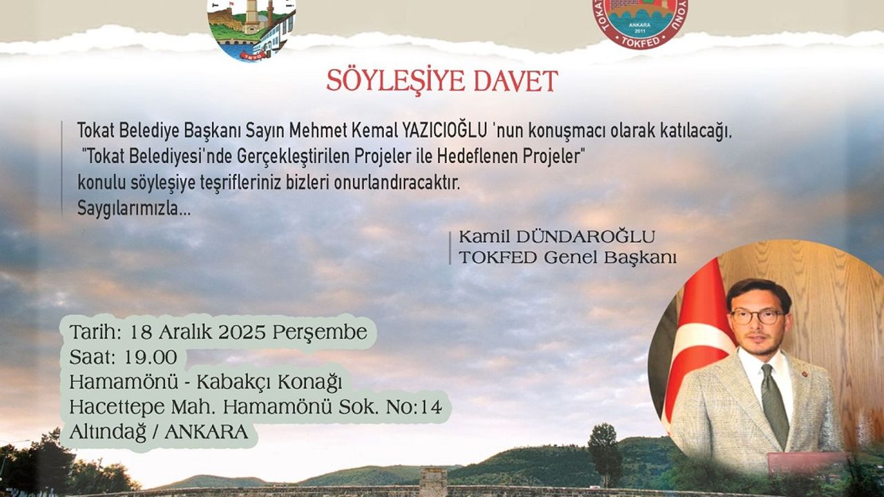 Tokat Dernekler Federasyonu (TOKFED), 13 yıldır her ay düzenlediği söyleşi programları kapsamında Aralık ayında Tokat Belediye Başkanı Mehmet Kemal Yazıcıoğlu’nu ağırlayacak. Etkinlik, Altındağ Belediyesi Hamamönü Kabakçı Konağı’nda gerçekleştirilecek.