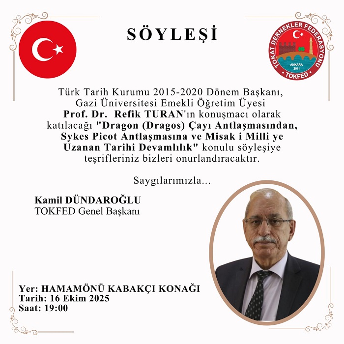 Ankara Tokat Dernekler Federasyonu (TOKFED), kültürel ve tarihi etkinliklerine bir yenisini ekliyor. Kabakçı Konağı Söyleşi programının Ekim ayı buluşmasında, Bizans İmparatorluğu ile Anadolu Selçuklu Devleti arasındaki sınırları belirleyen 1081 tarihli Dragon (Dragos) Çayı Antlaşması’ndan başlayarak Osmanlı topraklarının paylaşımını öngören 1916 tarihli Sykes-Picot Antlaşması ve sonrasında Misak-ı Milli’ye kadar uzanan süreçler ele alınacak.