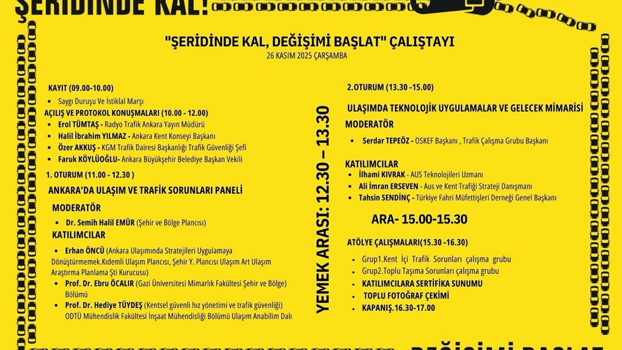 “Şeridinde Kal Kampanyası” kapsamında düzenlenen “Şeridinde Kal, Değişimi Başlat” çalıştayı, Ankara’daki trafik güvenliği, sürücü davranışları, toplumsal farkındalık, yayaların karşılaştığı riskler ve şehir içi ulaşımda iyileştirme önerilerini gündeme taşıyacak. Etkinlikte, alanında uzman akademisyenler ve sektör temsilcileri konuşmacı olarak yer alacak.