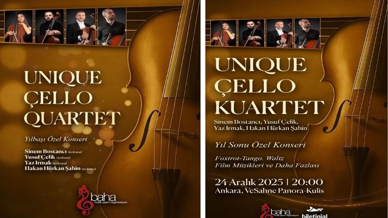 Baha Müzik Yaşam Organizasyonu tarafından düzenlenen Unique Çello Quartet Yılbaşı Özel Konseri, Sinem Bostancı, Yusuf Çelik, Yaz Irmak ve Hakan Hürkan Şahin’den oluşan kadrosuyla müzikseverleri yılın son günlerinde klasik müziğin büyülü atmosferiyle buluşturacak. Yılbaşı konseptine özel olarak hazırlanan programda, farklı türlerden seçkiler çellonun güçlü tonlarıyla yeniden yorumlanacak.
