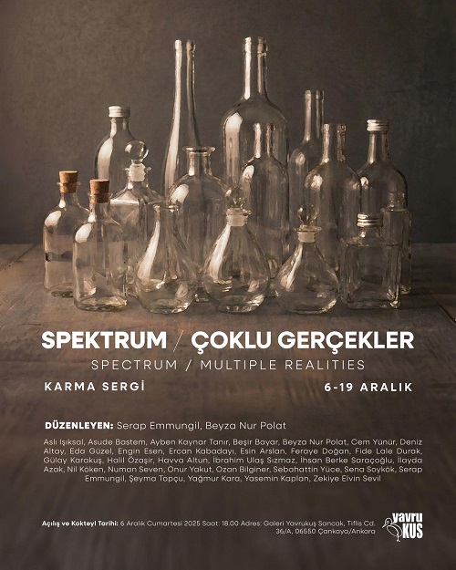 Yavrukuş Sanat Galerisi, 6 Aralık - 19 Aralık 2025 tarihleri arasında düzenleyeceği karma sergiyle sanatseverleri ağırlamaya hazırlanıyor. “Spektrum / Çoklu Gerçekler” isimli sergi, 30 sanatçının eserlerini bir araya getiriyor.